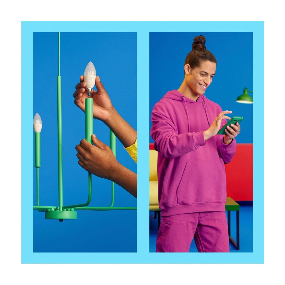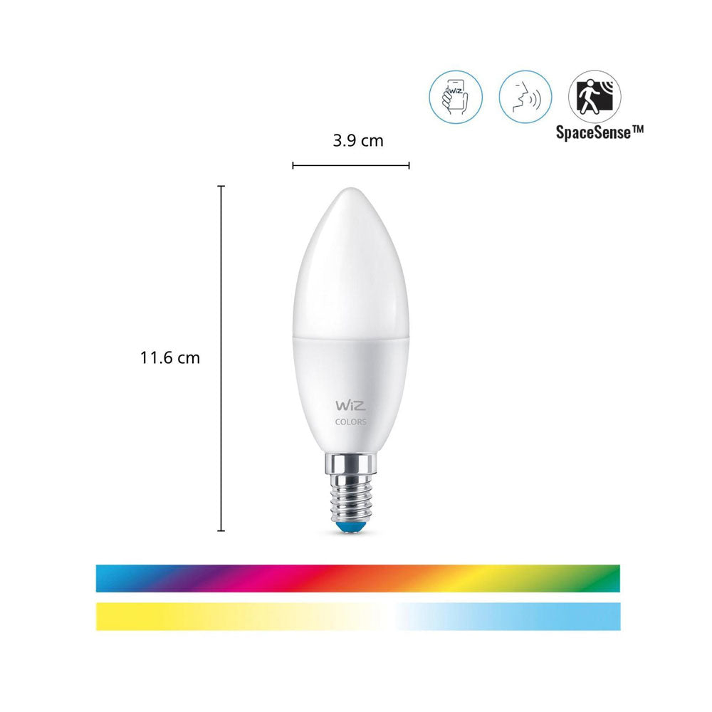 Add smart light to your candelabra fittings with a WiZ full-colour candle bulb with an E14 base. Use with the WiZ app or your voice to dim and brighten or use preset light modes on Wi-Fi setups.